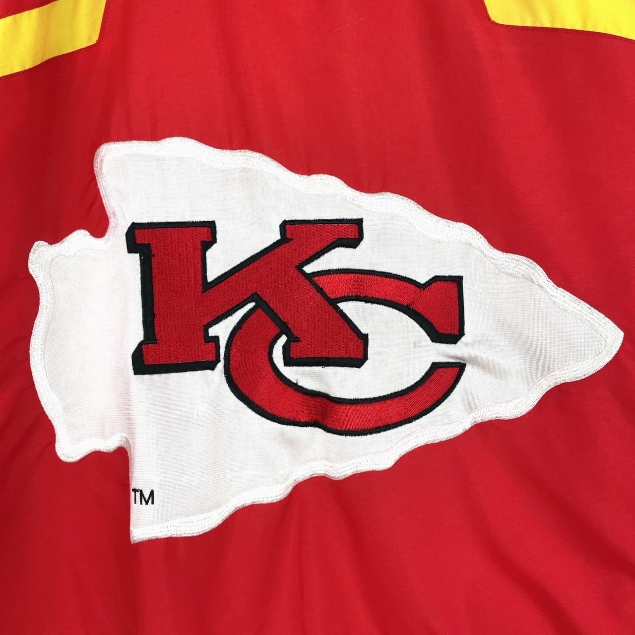 両肩、胸元、背中にカンザスシティ・チーフスの大きな刺繍ロゴ入り。なかなか出回っていない希少なデザイン。大きめのサイズなので、ビッグシルエットで着て頂けます。